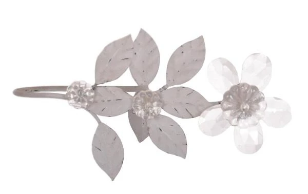 Magnifique paire d’embrasses en mĂ©tal gris pigeon, ornĂ©es de fleur en pampilles de verre transparent. Sublimez vos rideaux et voilages !