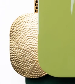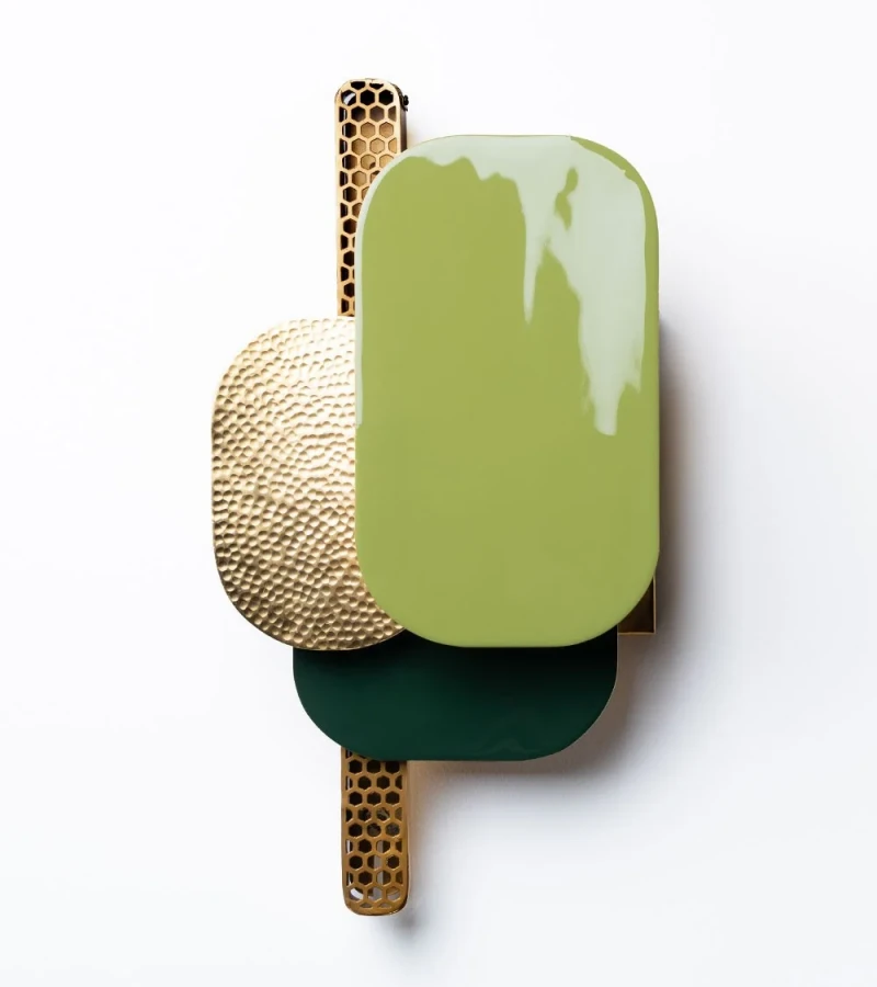 Cette applique est entièrement réalisée en aluminium avec une superposition de plaques aux formes arrondies de différentes couleurs.