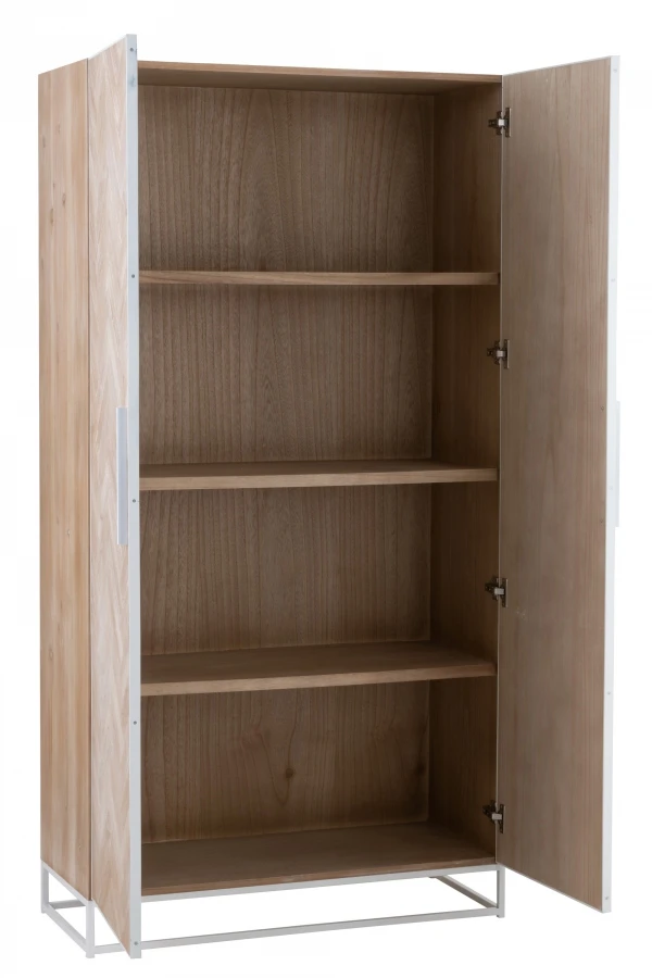 2 portes bois avec poignées métal ouvrent sur 3 étagères.