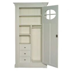 Cette bonnetière propose 1 porte habillée d’une lucarne et ouvrant sur 3 tiroirs, 2 petites étagères, 2 grandes étagères et 1 petite penderie.
