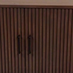 Ce buffet bas est entièrement réalisé en bois de manguier teinté foncé. Ce meuble propose 2 portes joliment travaillées ouvrant sur 2 étagères et donc 4 casiers de rangement.