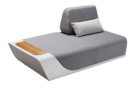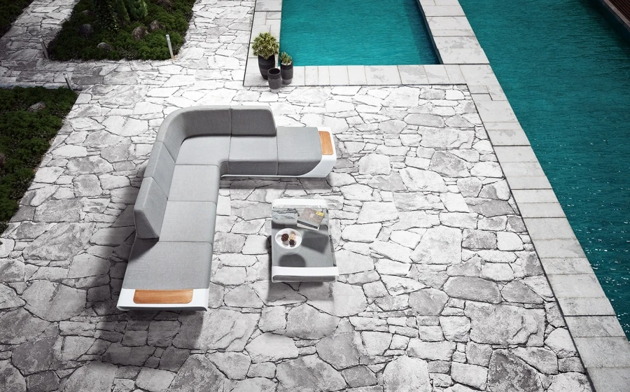 Le canapé bas de gauche en aluminium blanc et coussins gris.