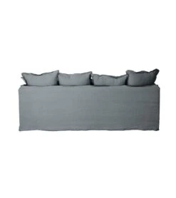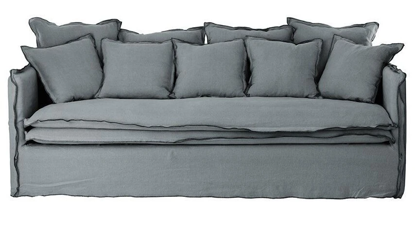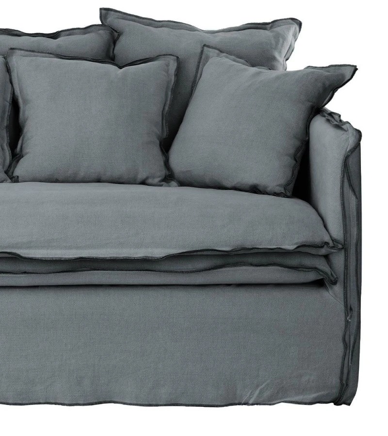 Ce canapé très cosy est réalisé en avec une ossature en bois et est habillé d’un tissu 100% lin. Il est pourvu de 10 coussins carrés de 2 tailles différentes.