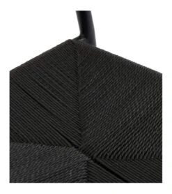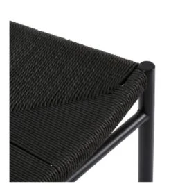 Chaise avec piètement mĂ©tal noir, habillĂ©e d’un assise en corde teintĂ©e noir et dossier en bois noir.