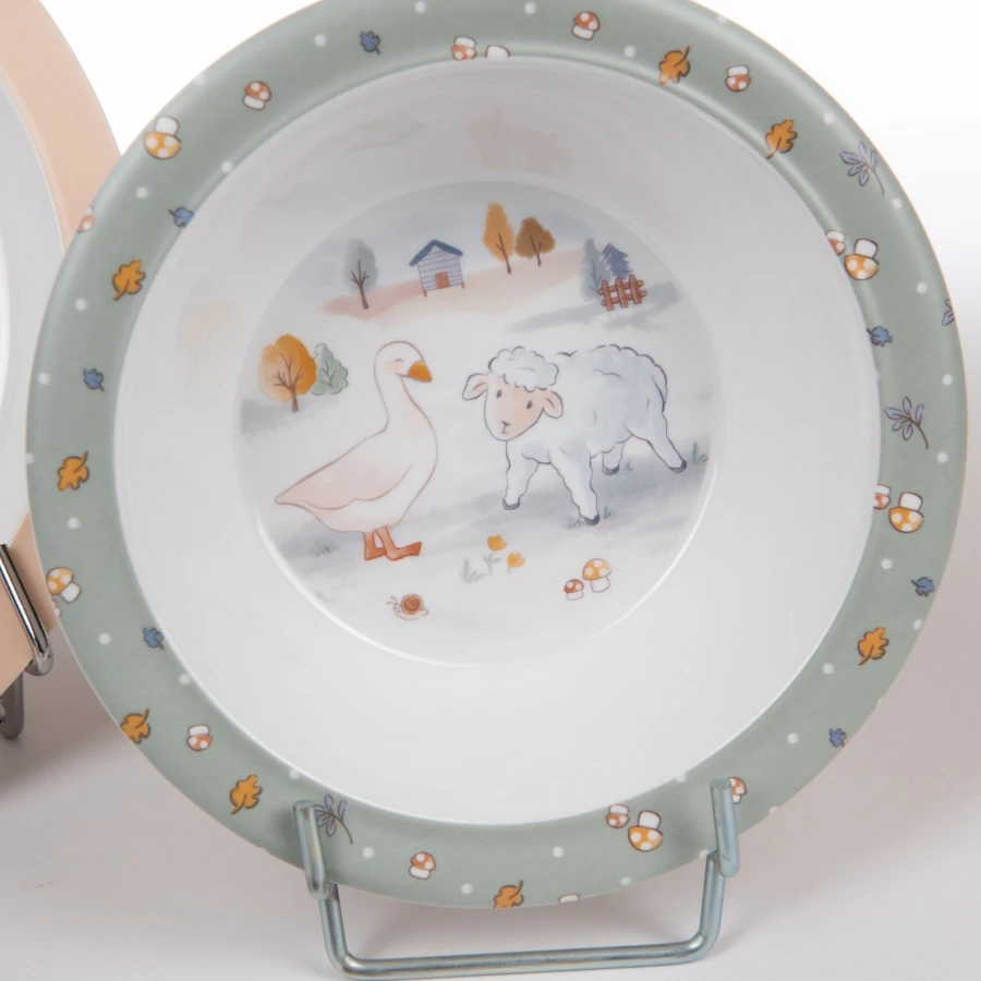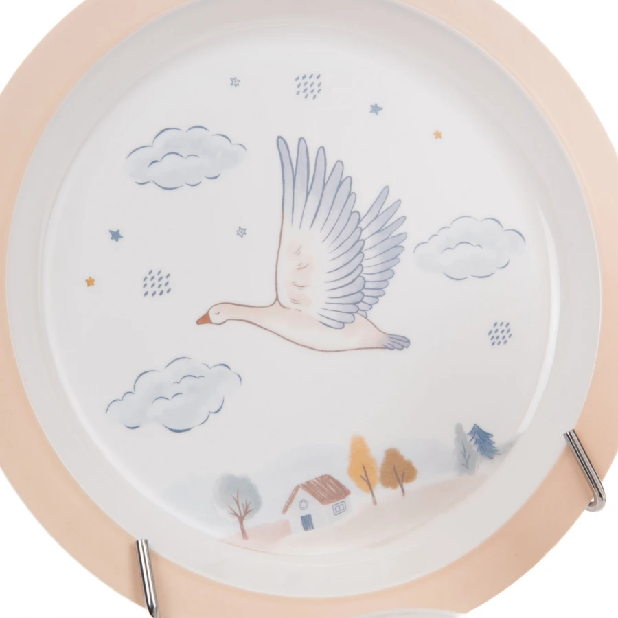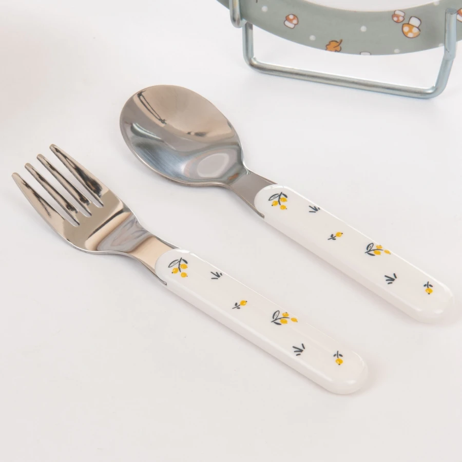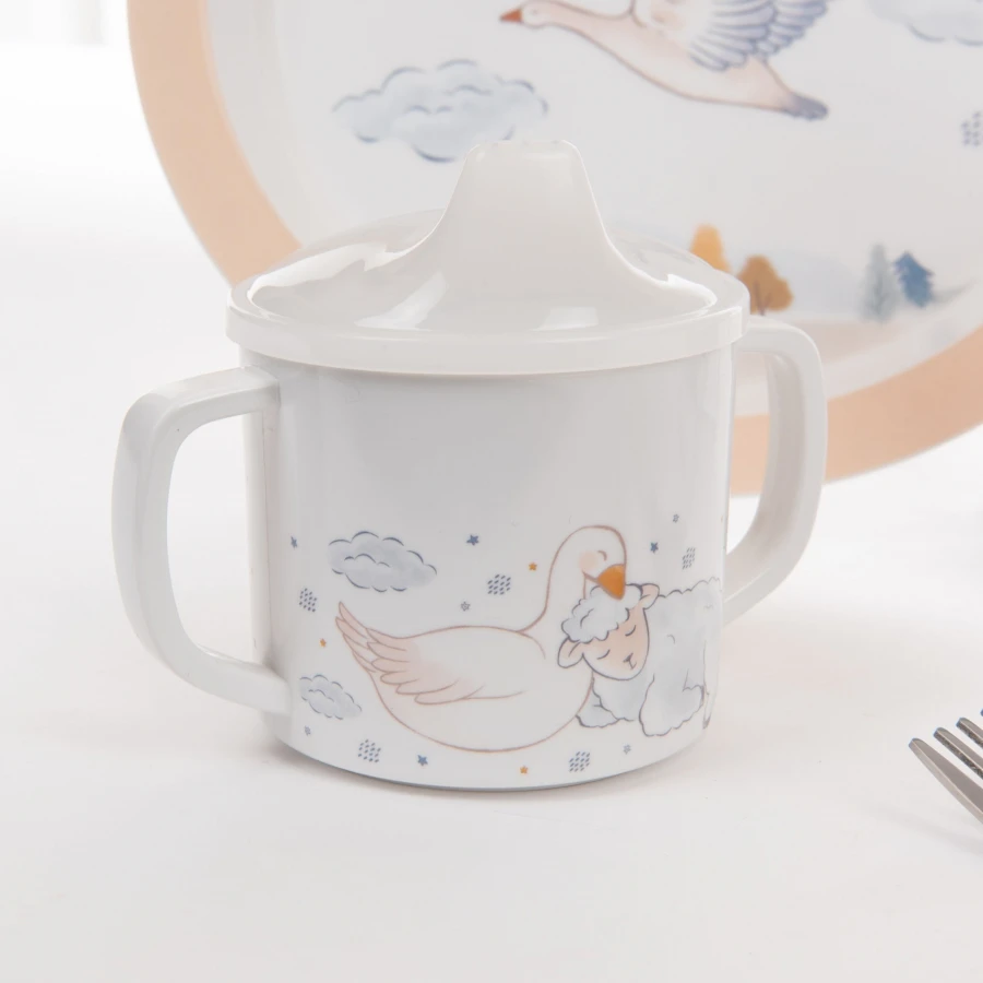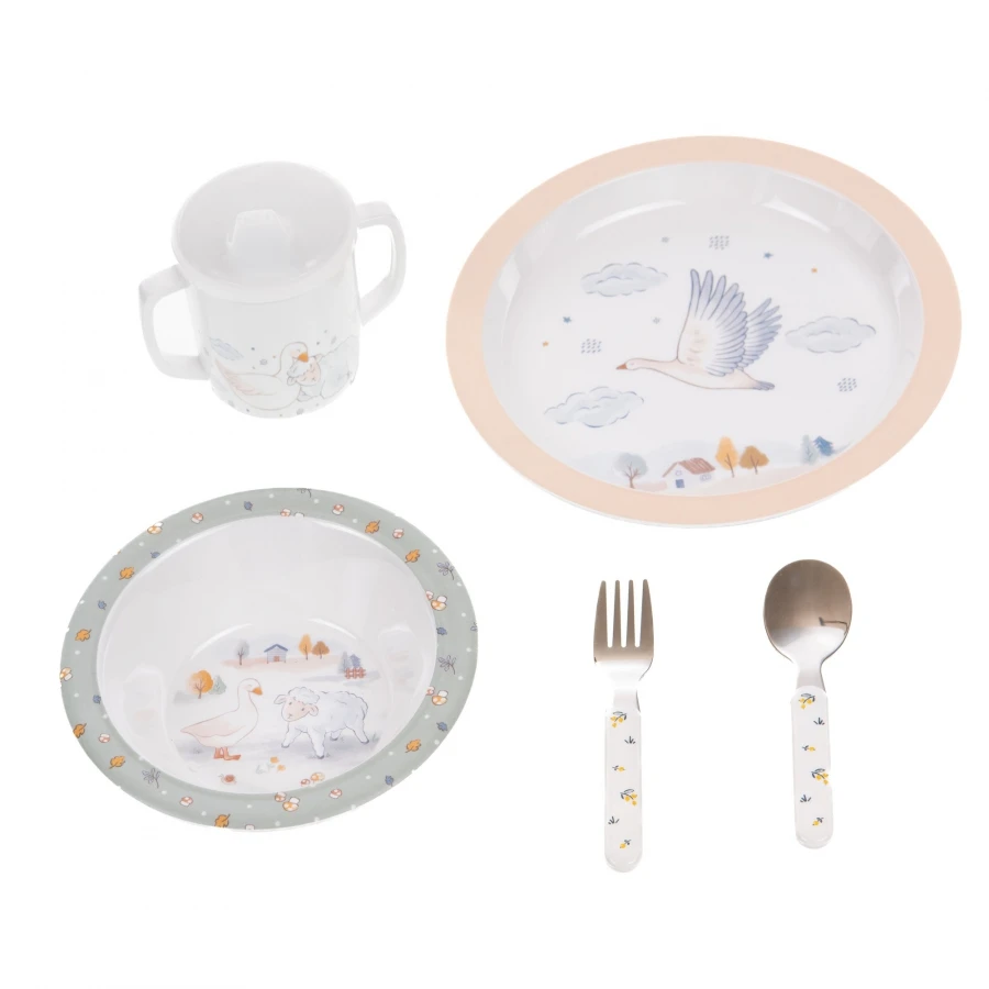 Ce coffret comprend 1 assiette plate, 1 assiette creuse, 1 gobelet évolutif anti-fuites, 1 fourchette et 1 cuillère.