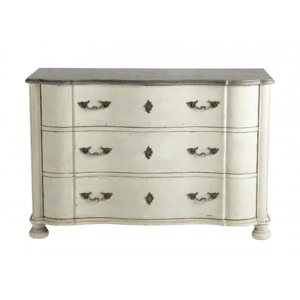 Magnifique commode réalisée en pin massif patiné écru vieilli et proposant 3 grands tiroirs avec poignées stylisées mordorées.