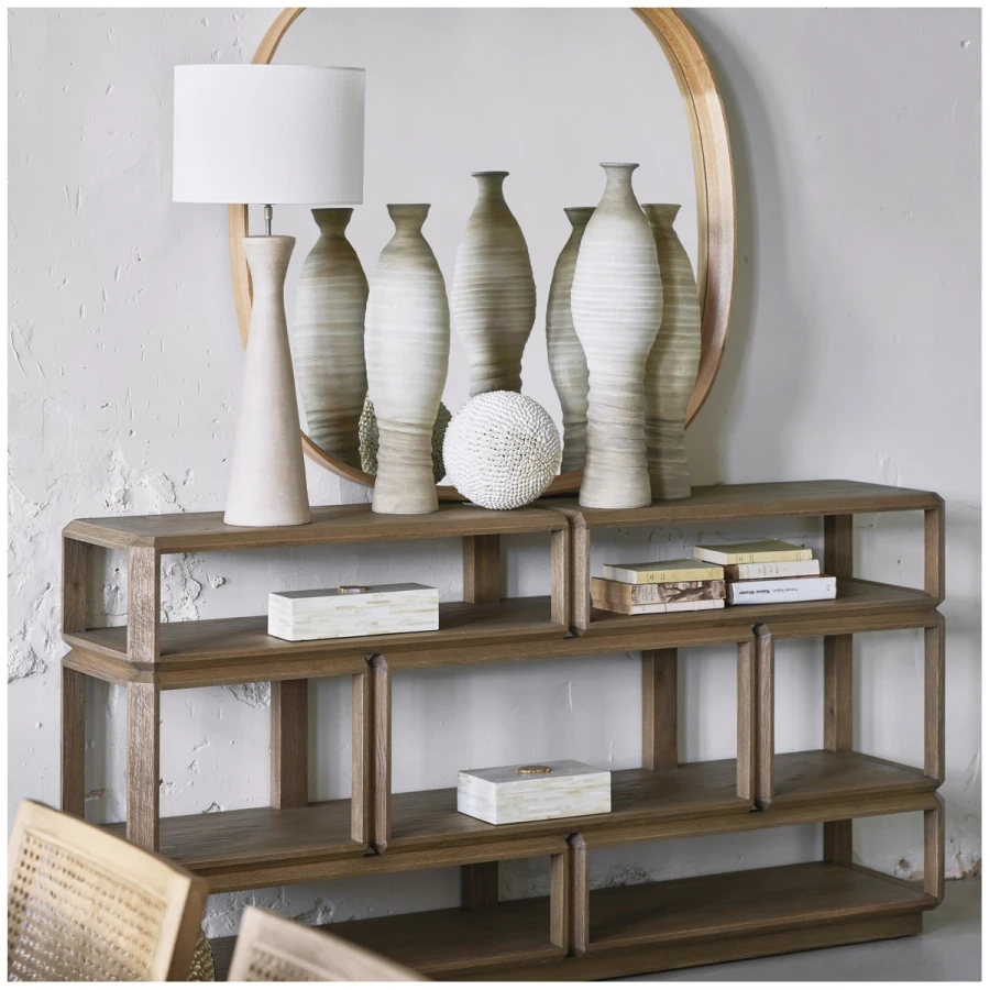 Sa structure entièrement réalisée en chêne naturel patiné vous permettra grâce a ses étagères multi-niveaux d’exposer tous vos objets de décoration ou de ranger vos plus beaux livres.