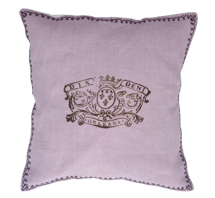 Ce coussin carré est réalisé en lin de couleur glycine, habillé de son emblème royal sur la face avant ainsi que de jolis points de broderies sur tout le pourtour.