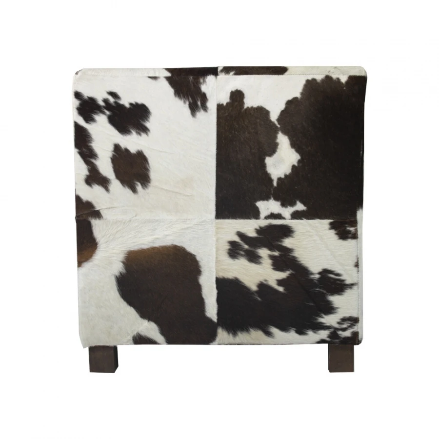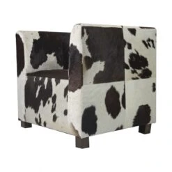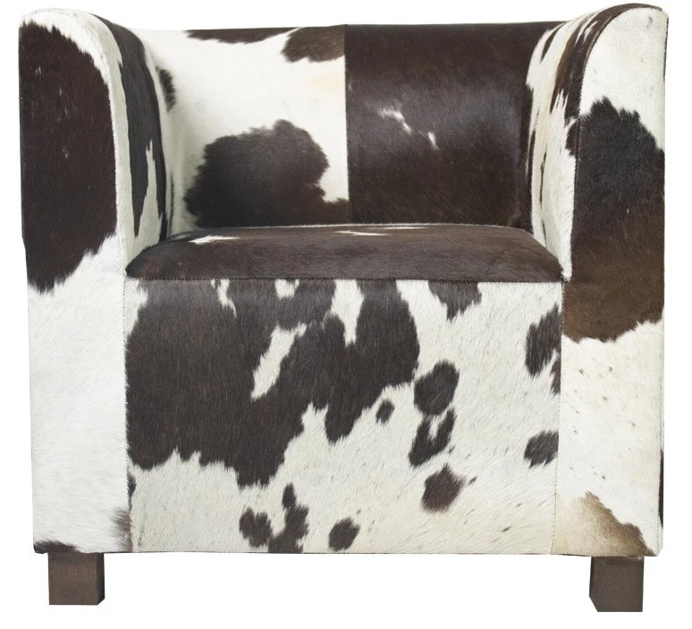 Magnifique fauteuil club réalisé avec une ossature en bois et habillé de cuir (peau de vache) couleur brun foncé et blanc. Piètement 4 pieds carrés en bois foncé.
