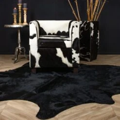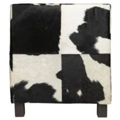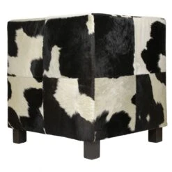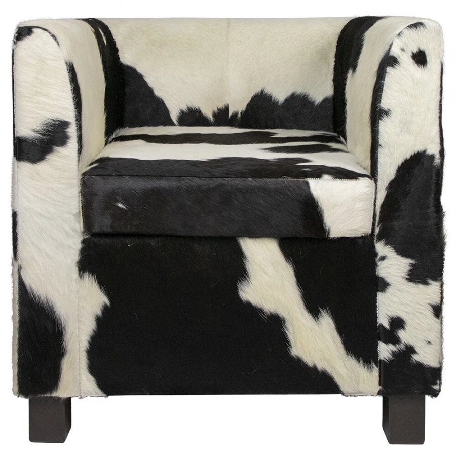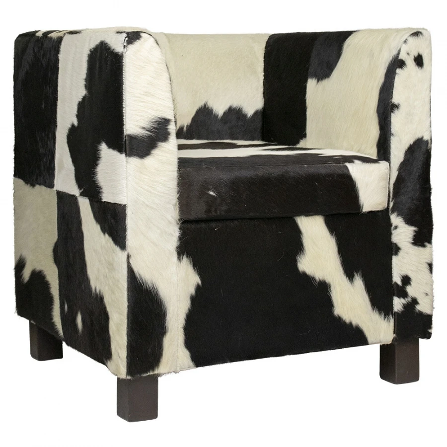 Magnifique fauteuil club réalisé avec une ossature en bois et habillé de cuir (peau de vache) couleur noir et blanc. Piètement 4 pieds carrés en bois foncé.