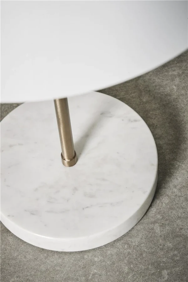 La lampe Sofia est réalisé en métal or clair sur un socle rond en marbre blanc.