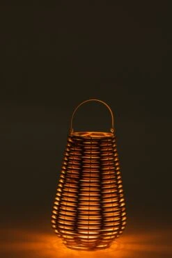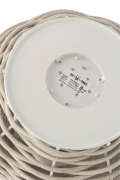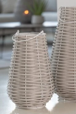 Très chic lanterne réalisée avec une armature en métal blanc habillé d’un tressage en imitation rotin blanchi.