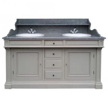 Très chic meuble lavabo double vasque de la collection Rivoli. Meuble entièrement rĂ©alisĂ© en pin massif patinĂ©. Ce meuble est habillĂ© d’un plateau en bois Ă©galement avec une finition façon pierre recouvert d’un vernis marin.