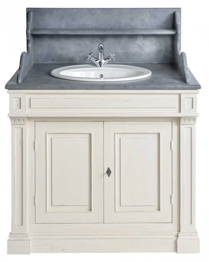 Très chic meuble lavabo simple vasque de la collection Rivoli. Meuble entièrement rĂ©alisĂ© en pin massif patinĂ© Vintage (vieilli) et habillĂ© d’un plateau en bois peint finition pierre recouvert d’un vernis marin.