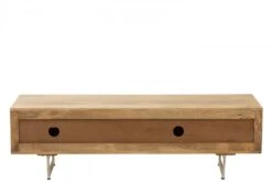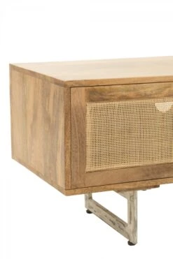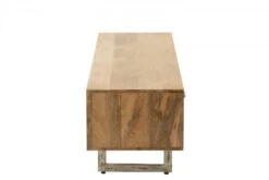 Meuble bas TV réalisé sur un piètement métal, structure bois naturel proposant 3 portes ouvrant sur 2 niches de rangement.