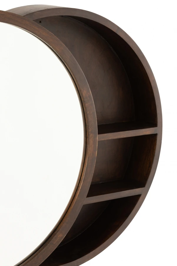 Très belle nouvelle collection de style coloniale, avec ce miroir très original entièrement réalisé en manguier teinté foncé et proposant en son intérieur 2 petites étagères pour le rangement discret.