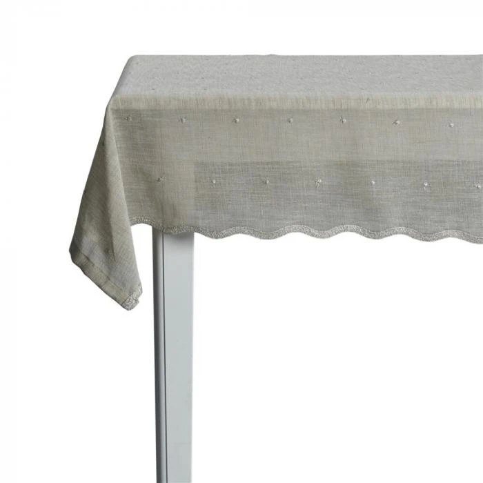 Très jolie nappe rectangulaire en tissu couleur sable, habillĂ©e d’un feston et de points clair sur les longueurs. Très belle nappe pour reçevoir !