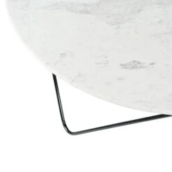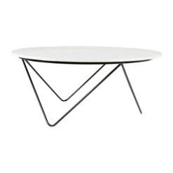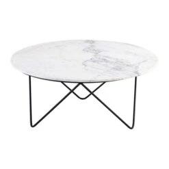 Voici une très jolie table basse très originale avec son piètement en métal noir habillée d’un plateau rond en marbre blanc. Du plus chic effet !