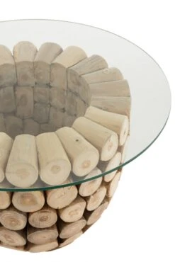 Cette petite table d’appoint ronde faite d’un empillement de rondins naturel et habillĂ©e d’un plateau rond en verre trempĂ©.