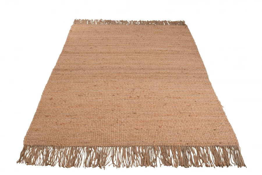 Très grand tapis rectangulaire réalisé en fibres végétales et habillé de franges effilochées sur les extrémités.